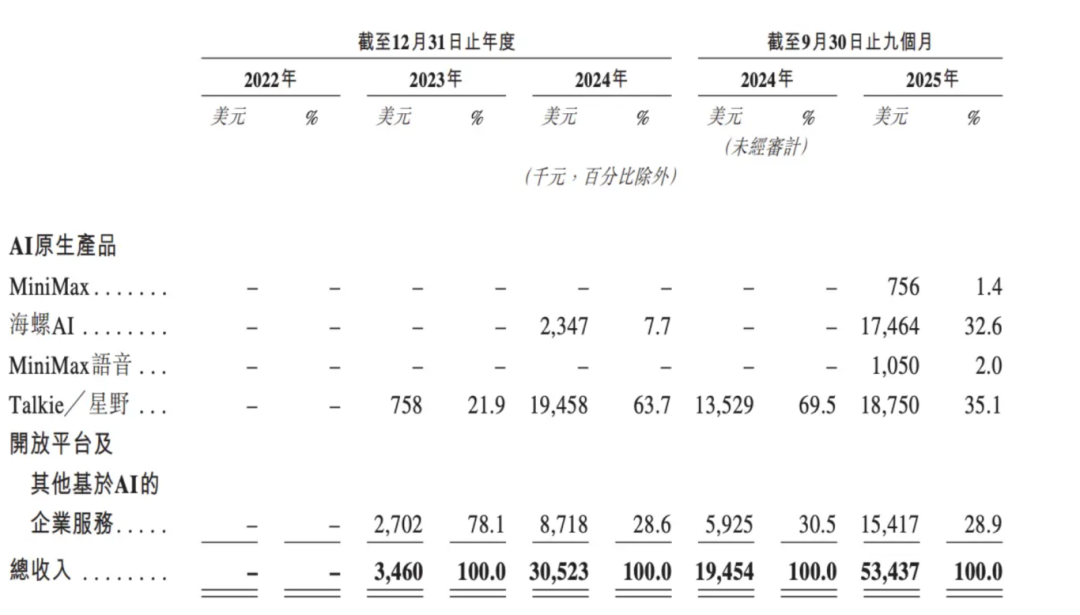 因为成立时间较晚,MiniMax直到2023年才开启商业化,到2024年营收来到了3052万美元,2025年前9个月,MiniMax的营收总额来到了5343.7万美元,同比增长174.68%,呈现了爆发式增长。