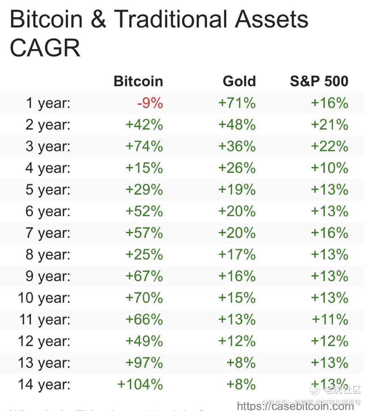 •Bitcoin 的 CAGR 始终显著高于传统资产