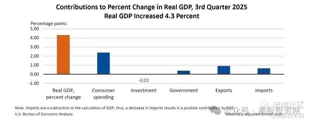 根据美国经济分析局(BEA)最新补发的报告,美国第三季度GDP年化增速竟然达到了4.3%,不仅远超市场预期的3.3%,更刷新了过去两年的增长纪录。配合此前二季度3.8%的强劲表现,这根本不是大家担心的经济放缓。