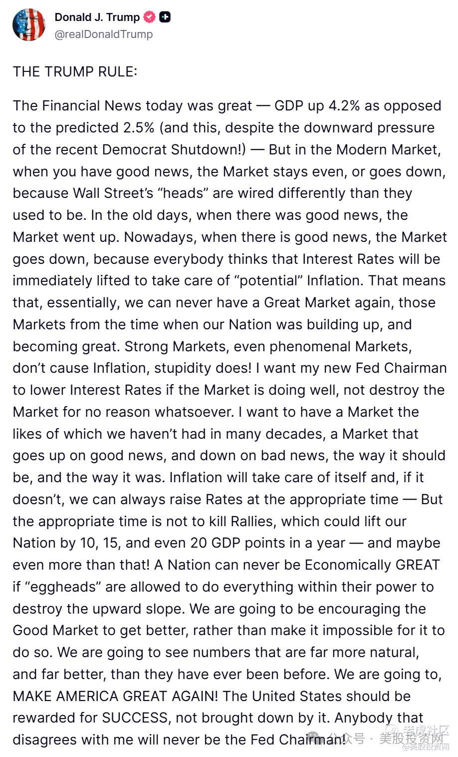 数据一出,白宫坐不住了。特朗普在社交平台上一边猛夸GDP的增速远超预期,一边直接把矛头对准了美联储。他批评现在的市场反应太“反常”:明明是经济大好的喜事,华尔街却总担心美联储会为了预防通胀而加息,导致美股涨不动。