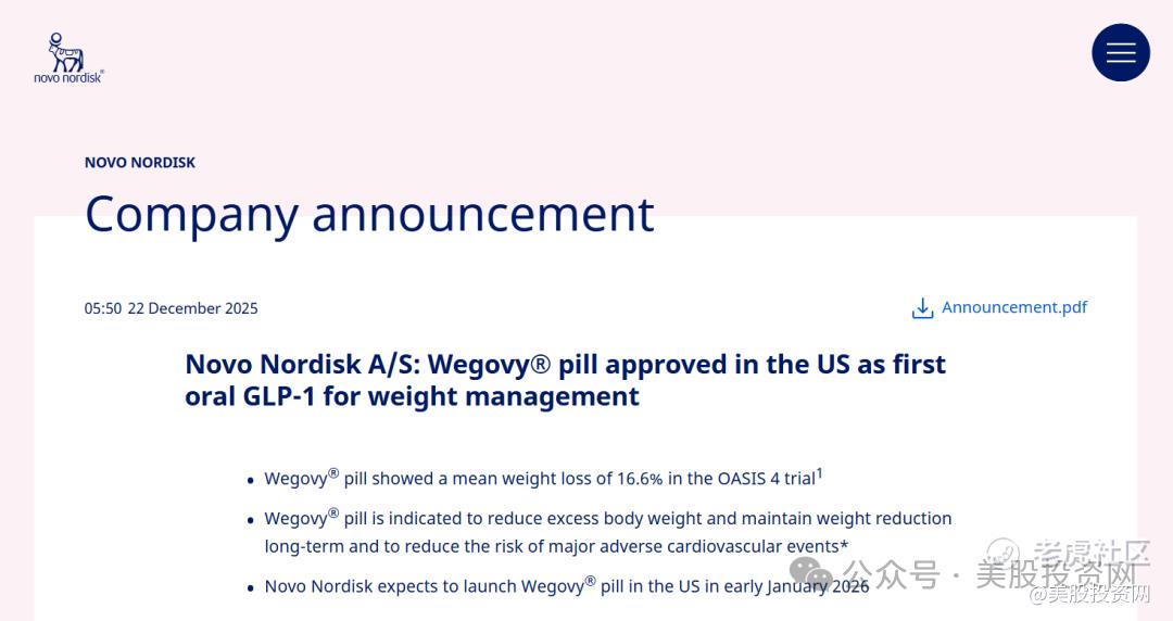 诺和诺德(NVO)今天大涨超7%,消息面上该公司宣布,其重磅减肥药Wegovy的片剂版本已获准在美销售,并计划于1月初正式上市。 $诺和诺德(NVO)$