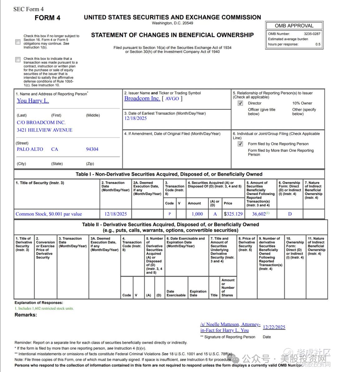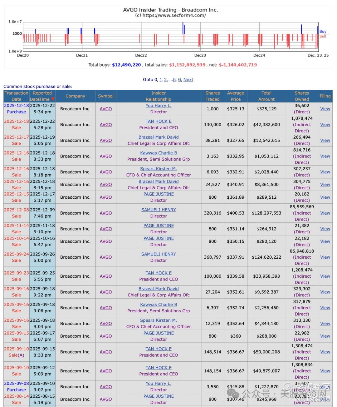 至此,博通高管团队年内的减持总额已突破1亿美元。尽管分析师普遍认为,这类基于预定计划的减持多出于个人税务或资产配置考量,而非看淡公司基本面,但在博通处于高位的敏感时期,这种集中减持的行为依然在一定程度上考验着投资者的持股信心。