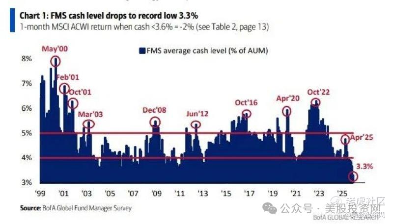 美股市场中的机构投资者已经表现出极高的风险偏好,且现金持有水平降至历史低位,甚至创下3.3%的新低。