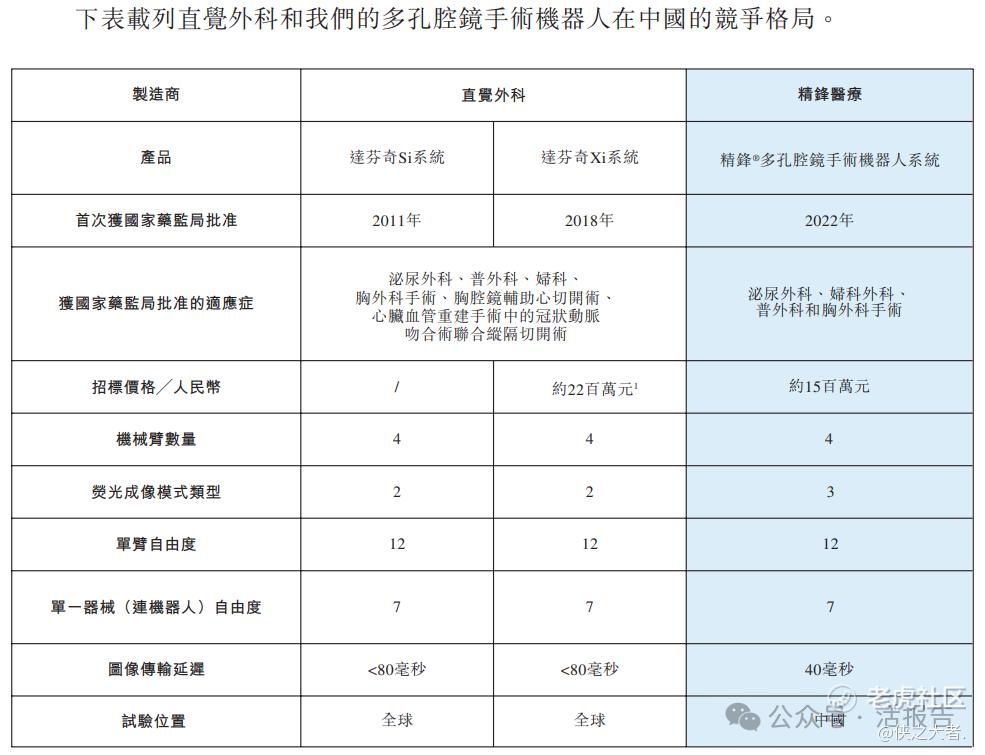 精锋®多孔腔镜手术机器人已获得国家药监局批准用于泌尿外科手术、妇科、普外科及胸外科手术,将主要在中国与达・芬奇Xi及Si手术系统形成竞争。截至最后可行日期,中国共有13款多孔腔镜手术机器人获国家药监局批准,其中11款为国内品牌,2款为海外品牌。