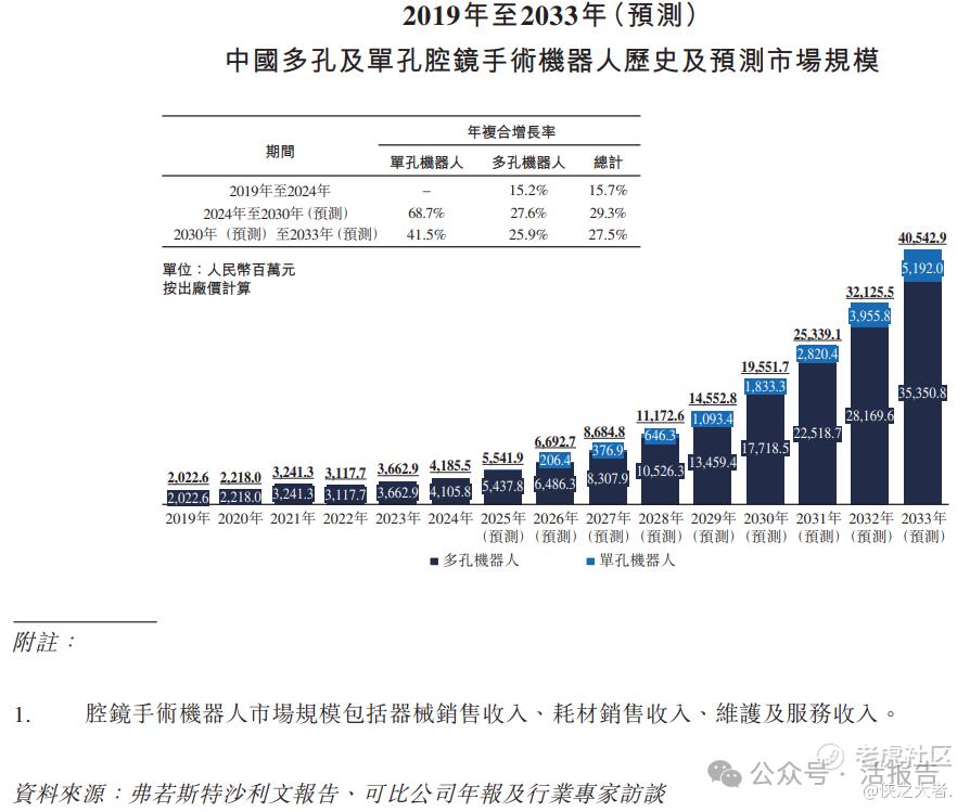 据弗若斯特沙利文(Frost & Sullivan)的资料,中国多孔腔镜手术机器人市场规模由2019年的人民币20.226亿元增长至2024年的人民币41.058亿元,年复合增长率为15.2%,预计截至2033年将达到人民币353.508亿元,2024年至2033年的年复合增长率为27.0%。