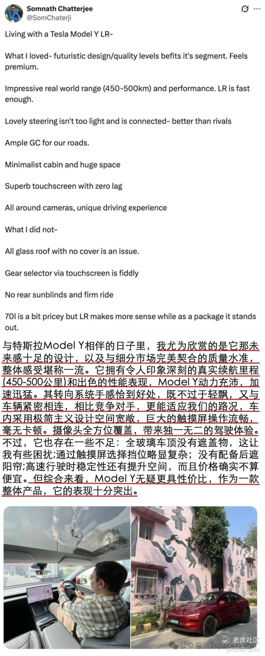 产品强大的综合实力也让Model Y在全球范围内收获了用户真实良好的口碑。车主@SomChaterji 在社交平台分享购车心得时表示,Model Y兼具强劲性能、可靠续航、便捷操作、独特驾驶体验与宽敞空间,堪称“毫无短板”,是细分市场中最具性价比的选择。
