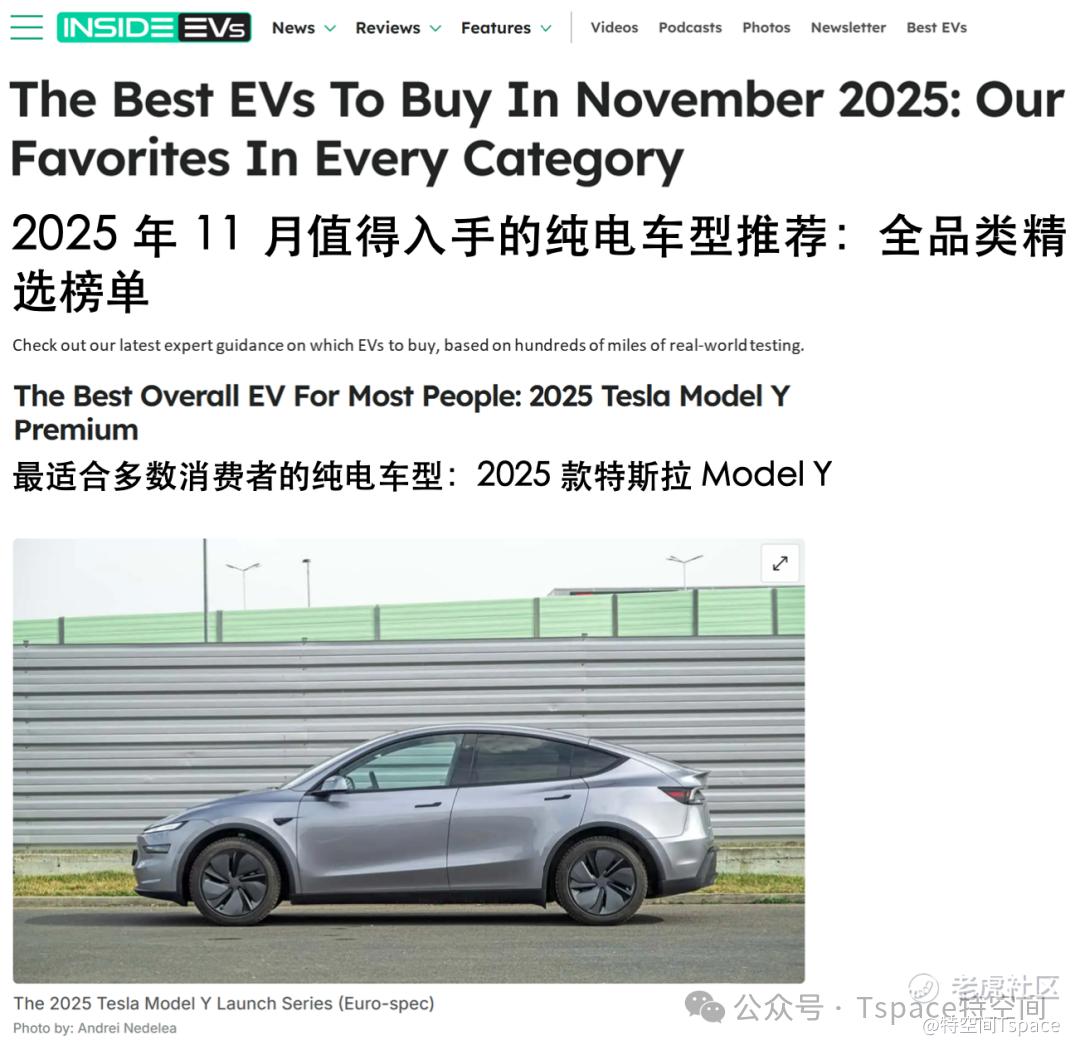 近日,海外权威媒体InsideEVs发布11月纯电动车购车指南。在对价格、续航、性能及智能化等多项核心指标进行综合评估后,特斯拉Model Y获评最适合大多数用户的“最佳纯电动车”。