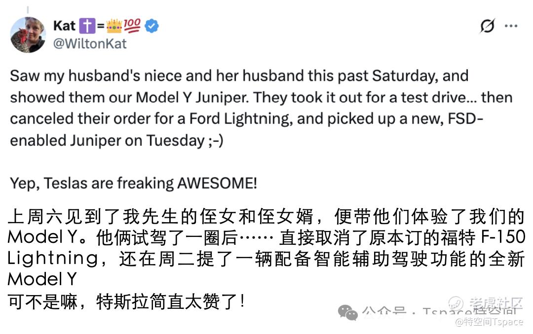 在海外博主@WiltonKat 的经历中,带亲戚试驾Model Y后,对方直接取消了原本预订的其他品牌车型,三天后提走了一辆配备智能辅助驾驶功能的Model Y。