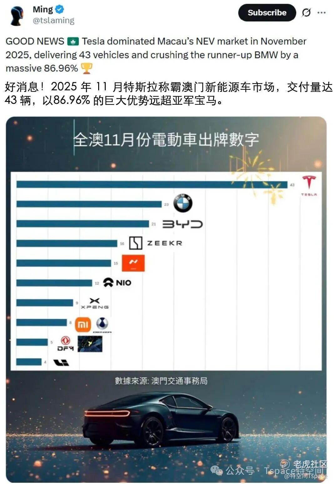 特斯拉稳居澳门11月最畅销的纯电动车,销量是宝马的2倍