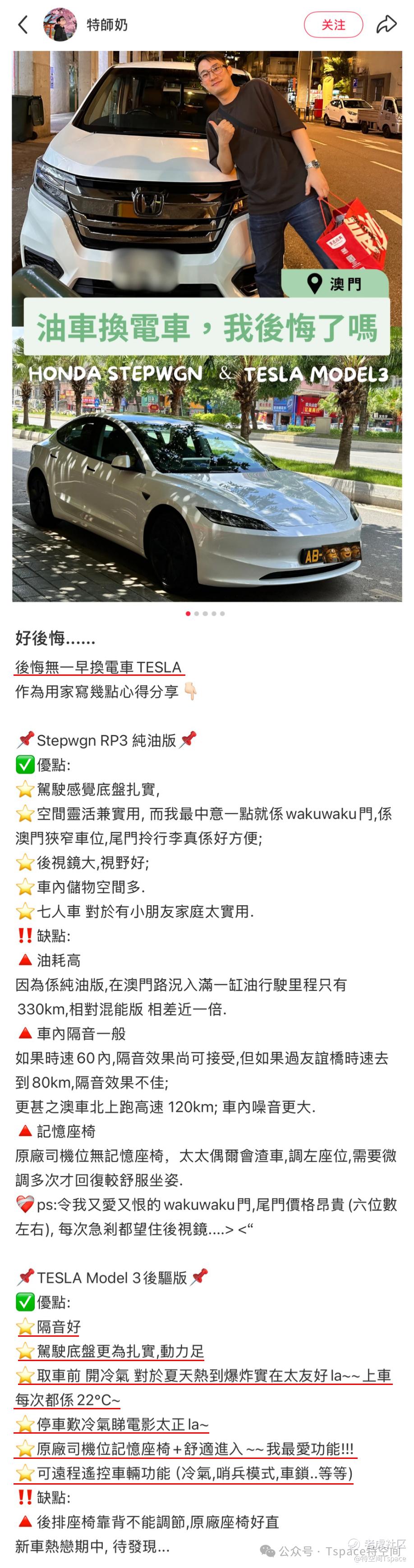 其中,燃油车置换车主@特师奶 的看法颇具代表性。当初他打算置换手中的燃油车时,便目标明确地直接将特斯拉Model 3作为对比对象。