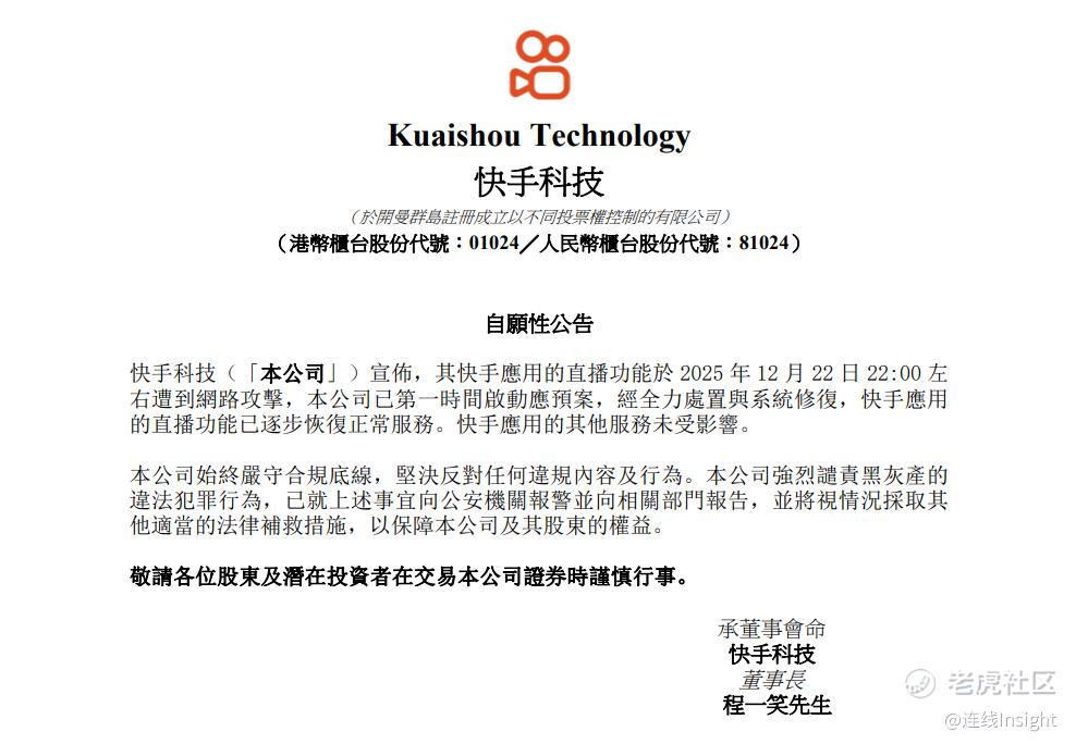 虽然快手在12月23日的回应公告中强调,快手应用的直播功能已逐步恢复正常服务。快手应用的其他服务未受影响。