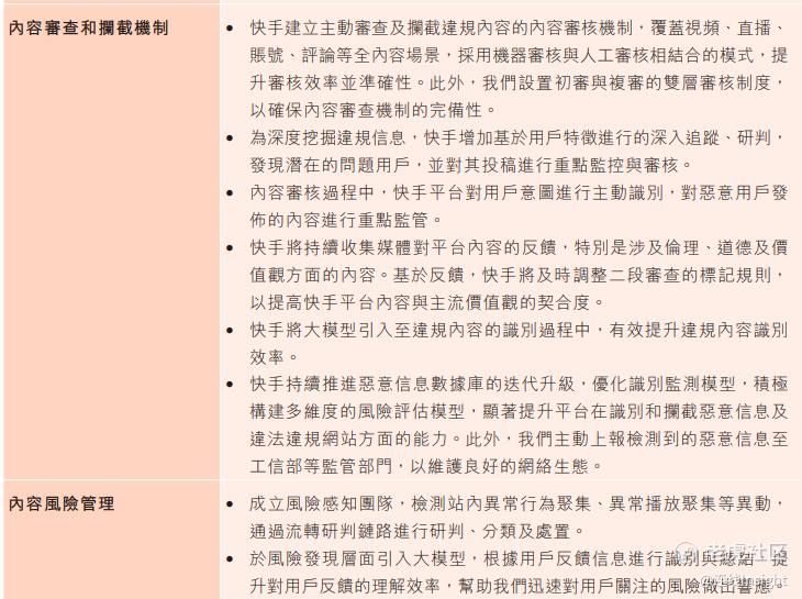 快手也在财报中披露了其内容风险管理机制:公司已经成立了风险感知团队,检测站内异常行为聚集、异常播放聚集等异动,通过流转研判链路进行研判、分类及处置。