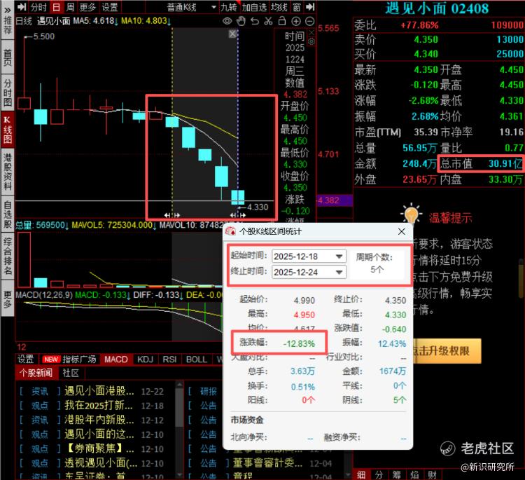 最近这段时间,遇见小面股价似乎开启大范围下跌之势,在12月18日以4.99港元/股的开盘价,市值约为35.55亿港元,截止12月24日,历经5个交易日已经下跌达12.83%,市值为30.91亿港元,短短五个交易日,就掉了4.64亿港元,遇见小面股价可谓是“一泻千里”。