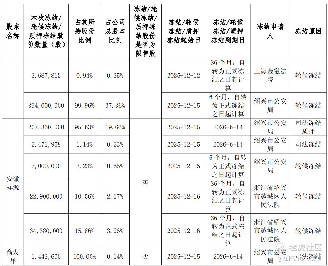 交建股份的情况同样严峻,控股股东祥源控股持有的44.32%公司股份已全部被冻结、标记及轮候冻结。实际控制人俞发祥个人持有的1572.91万股也被全额冻结。