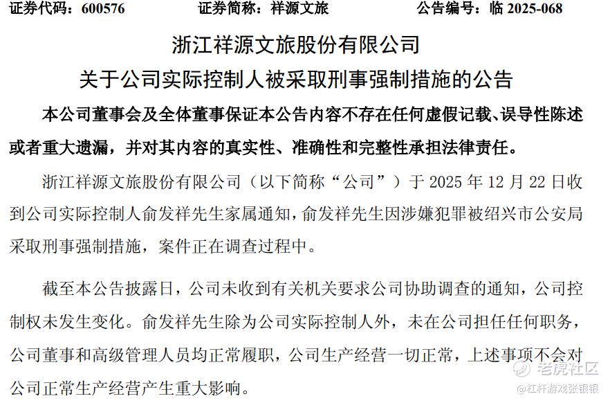 近日,上市公司祥源文旅、交建股份、海昌海洋公园接连披露公告,称收到了实际控制人俞发祥先生家属的通知,俞发祥因涉嫌犯罪,已被其家乡——浙江绍兴市的公安局采取刑事强制措施。