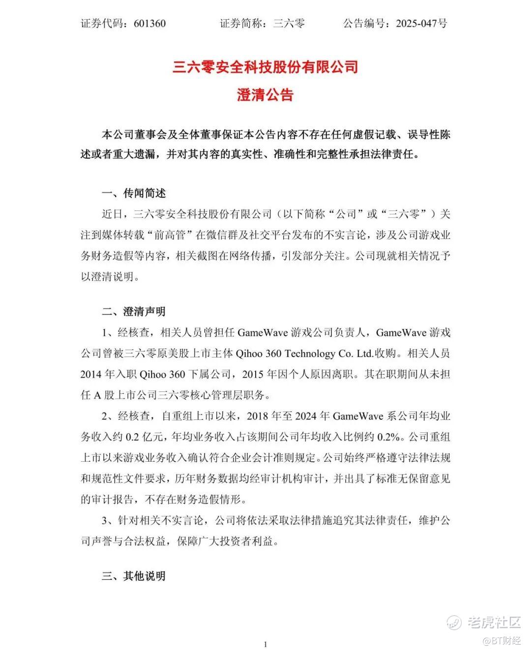 次日,三六零(以下称360)公司紧急发布公告回应称,玉红曾担任GameWave游戏公司负责人,于2014年入职360下属公司,2015年因个人原因离职,在职期间从未担任A股上市公司三六零核心管理层职务。2018年至2024年GameWave系公司年均业务收入约0.2亿元,年均业务收入占该期间公司年均收入比例约0.2%。公司重组上市以来游戏业务收入确认符合企业会计准则规定。针对相关不实言论,公司将依法采取法律措施追究其法律责任。