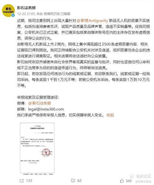 比如在12月22日,影石法务部发文,称近期网上出现大量针对影翎Antigravity 新品无人机的恶意不实信息,包括伪造消费者负评、诋毁产品质量及品牌声誉、造谣不实销量等。