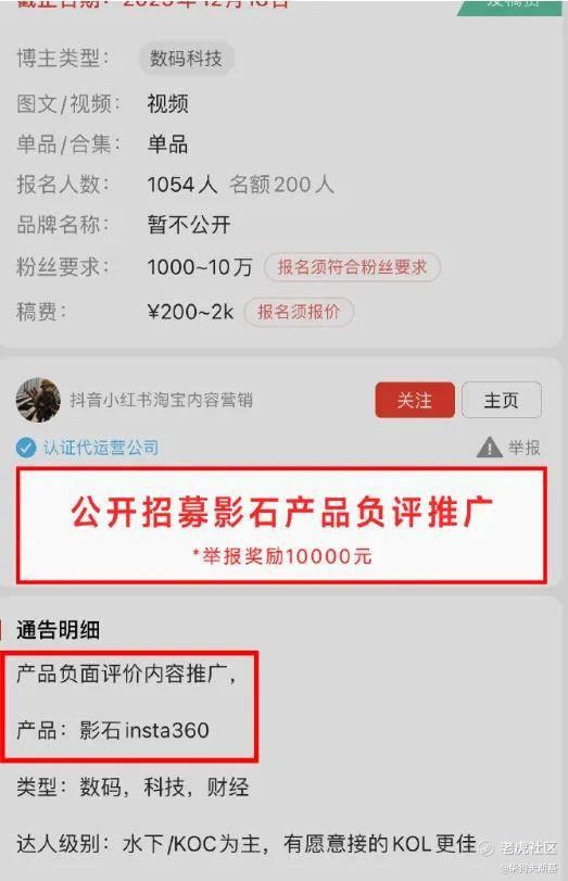 通过影石法务部公布的截图来看,有机构在招聘平台公然招聘影石产品负面推广人员,并对提供这条线索的人发放1万元奖励。