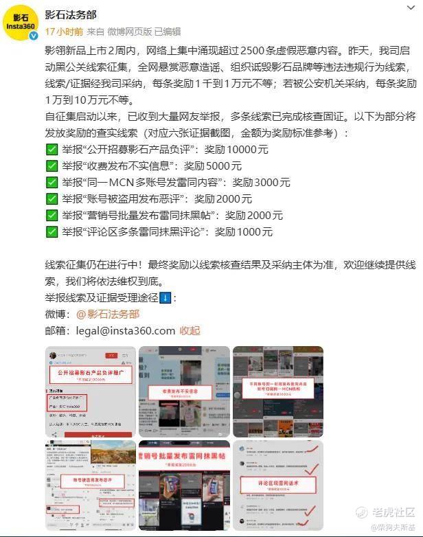 昨日晚,影石法务部再发文启动黑公关线索征集,全网悬赏恶意造谣、组织诋毁影石品牌等违法违规行为线索,线索/证据经我司采纳,每条奖励1千到1万元不等;若被公安机关采纳,每条奖励1万到10万元不等。