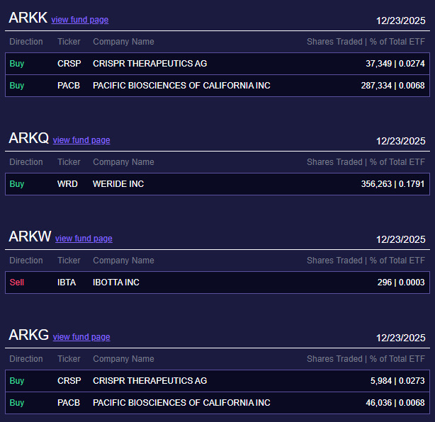 今天木头姐操作的比较少,今天买入310万美元中概股文远知行、240万美元CRSP、60万美元PACB,卖出6000美金IBTA应该不止那么少,邮件有些不会披露出来。