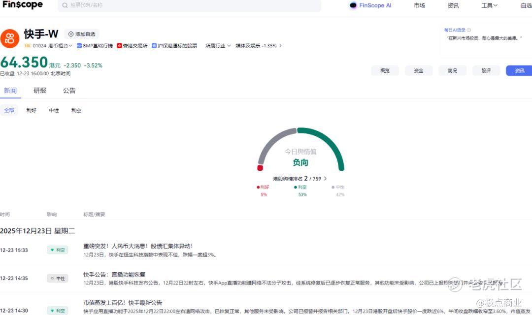 这一质疑也传导至资本市场,12月23日,快手开盘下跌3.3%,开盘后跌幅进一步扩大,一度下跌5.7%。
