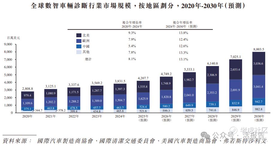根据弗若斯特沙利文(Frost & Sullivan)的报告,全球数智车辆诊断行业市场规模由2020年的约2,808.8百万美元增加至2024年的约3,831.5百万美元,复合年增长率为8.1%。预计到2030年,市场规模将进一步提升至约8,003.5百万美元,2024年至2030年的复合年增长率预计达13.1%。