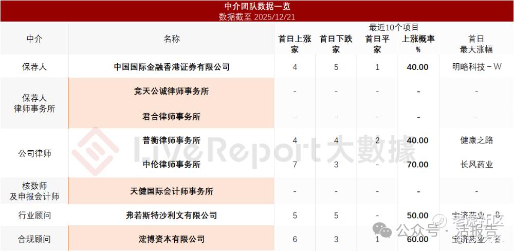 据**大数据统计,道通科技中介团队共计8家,其中保荐人1家,近10家保荐项目数据表现不理想;公司律师共计2家,综合项目数据表现有待加强。整体而言中介团队历史数据表现有待提升。