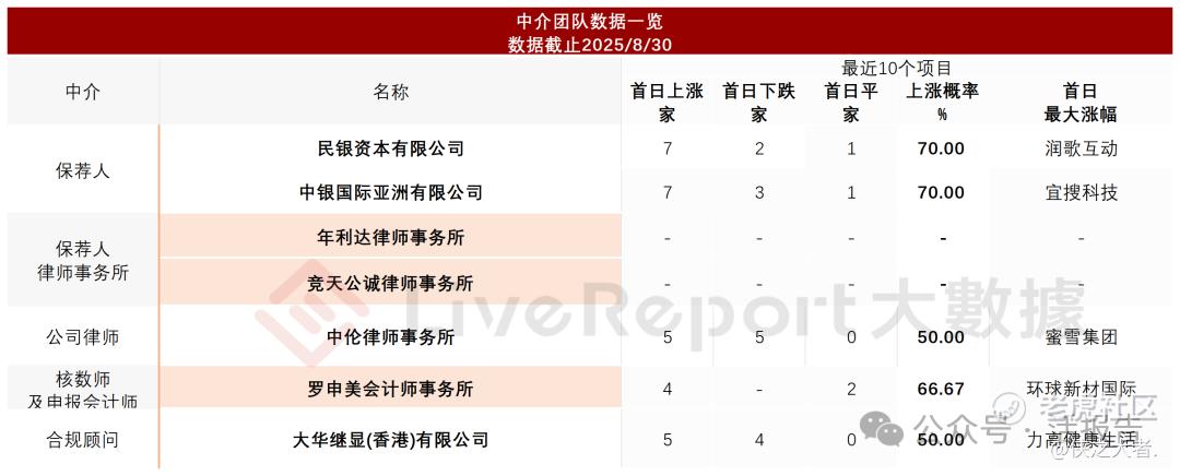 据**大数据统计,白鸽在线中介团队共7家,其中保荐人2家,近10家保荐项目数据表现中等偏上;公司律师共计1家,综合项目数据表现一般。整体而言中介团队表现中规中矩。