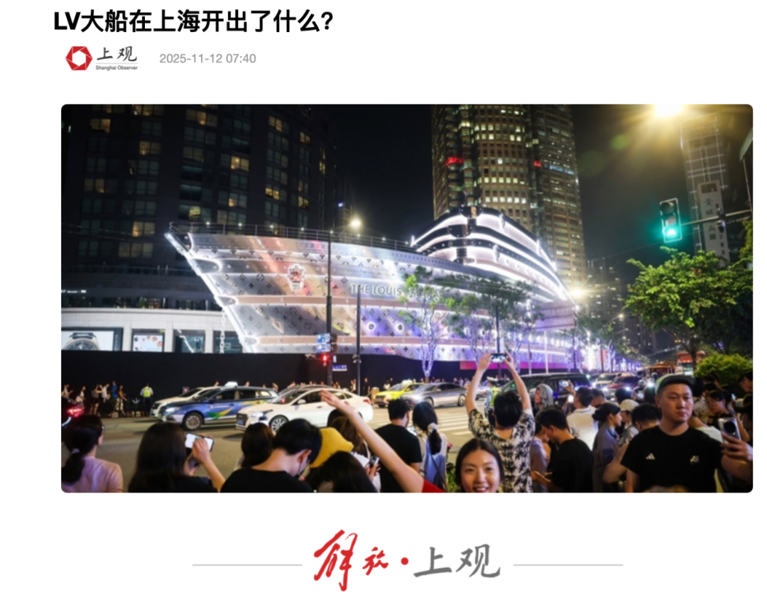 到上海,现在路易威登上海“永不启航”的船已经成为打卡地标,最近好几次去南京西路,都发现是水泄不通,这和一些街道门前冷落鞍马稀对比明显,上海官方上观现在一篇“LV大船在上海开出了什么”中总结道: