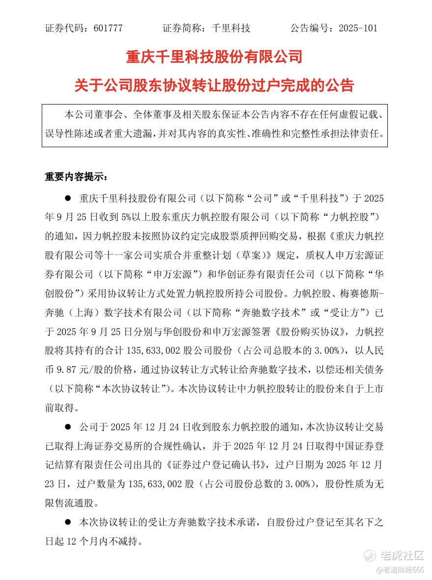 千里科技宣布,已经完成与梅赛德斯-奔驰(上海)数字技术有限公司的股份过户登记。奔驰数字技术以每股9.87元的价格,受让了力帆控股持有的约1.356亿股股份,占千里科技总股本的3%,正式成为公司第五大股东,交易也已全部交割完毕。 $吉利汽车(00175)$