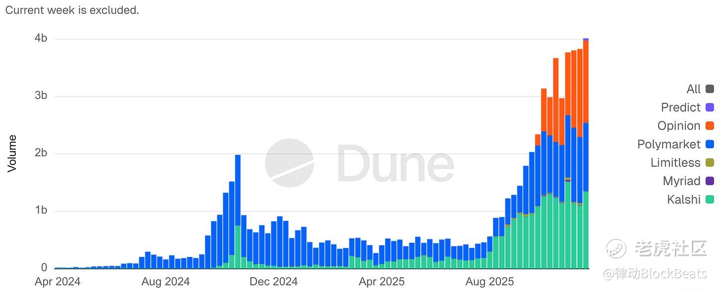 Opinion Trade(由 Opinion Labs 推出)将自身定位为一个「宏观优先」的链上预测交易平台,其市场形态更接近利率与大宗商品的仪表盘,而非以娱乐事件为主导的押注产品。该平台于 2025 年 10 月 24 日上线 BNB Chain,截至 2025 年 11 月 17 日,累计名义成交量已超过 31 亿美元,早期阶段的日均名义成交量约为 1.325 亿美元。 在 11 月 11 日至 17 日期间,平台周度名义成交量约 15 亿美元,位居主要预测市场平台前列;截至 11 月 17 日,其未平仓合约规模达到 6090 万美元,在当时仍落后于 Kalshi 和 Polymarket。