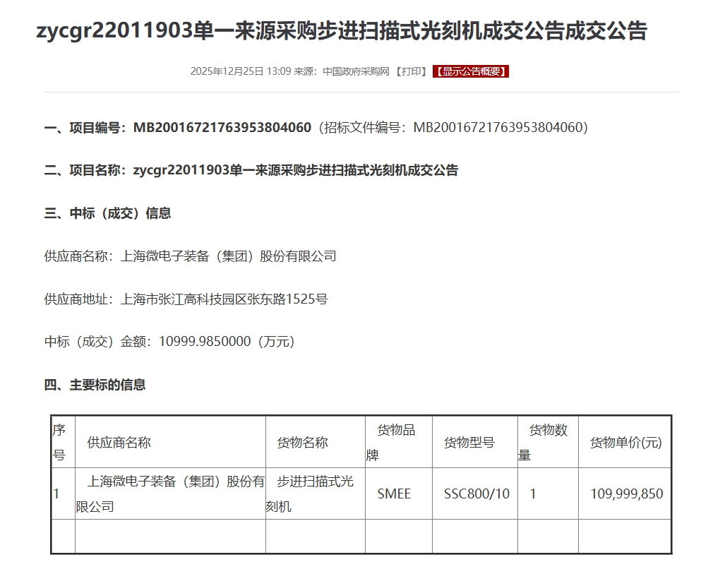 财联社快讯:上海微电子,1.1亿元中标一台光刻机