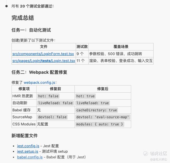 在测试编写环节,我们将目光锁定于关键的 LoginPage 组件。不同于简单的静态展示页,这个组件包含了表单验证、异步接口请求与路由跳转等复杂交互。M2.1 并未产出那种仅校验 DOM 是否存在的“注水代码”,而是基于 React Testing Library 交付了一套完整的行为驱动测试用例。