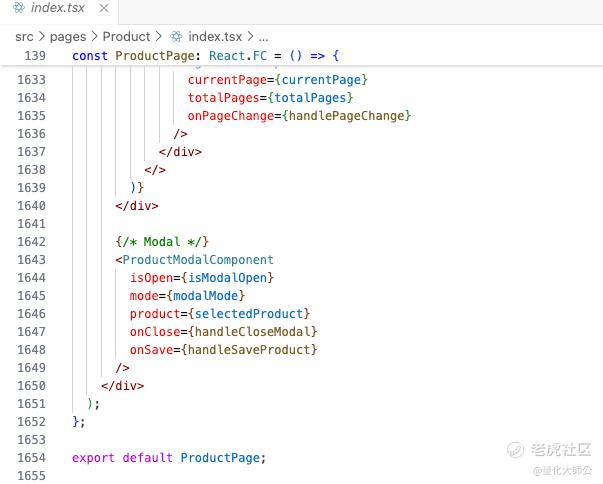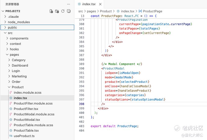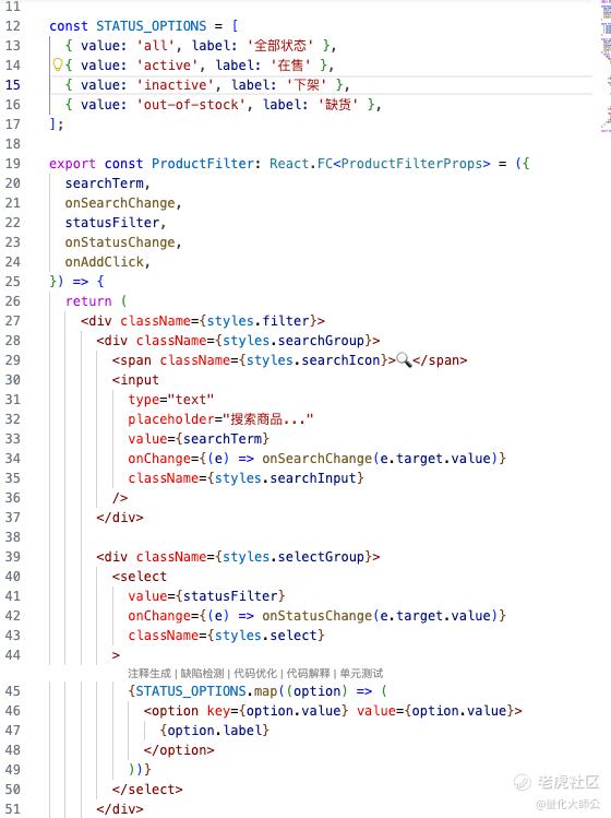 视图层的细节也没掉链子。生成的 ProductFilter 子组件拒绝了偷懒的行内样式,选用了严谨的 CSS Modules 方案。文件头部显式定义了 Props 接口,彻底告别了 any 类型这种埋雷行为。