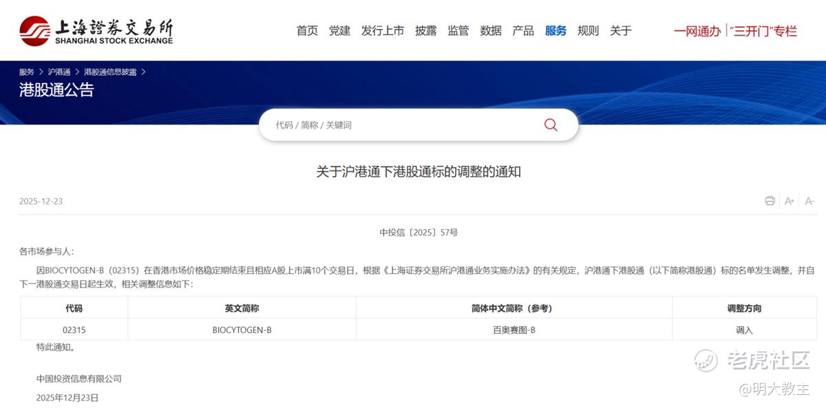 上海证券交易所12月23日发布公告,百奥赛图自下一个交易日(24日)起被正式纳入港股通标的。