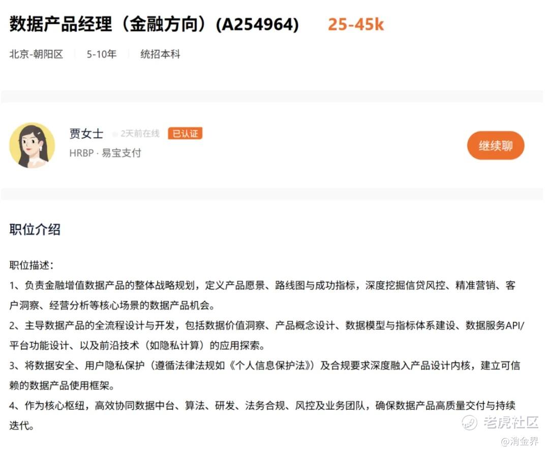 猎聘网上的信息显示,日前易宝支付发布了数据产品经理、金融大客户总监等多个岗位需求。其中数据产品经理(金融方面)的主要职责包括:负责金融增值数据产品的整体战略规划,定义产品愿景、路线图与成功指标,深度挖掘信贷风控、精准营销、客户洞察、经营分析等核心场景的数据产品机会等。
