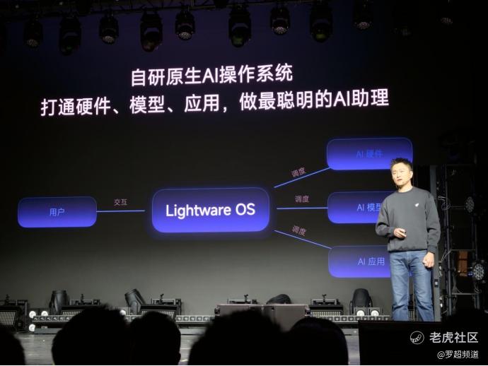 这就出现了另一个问题:如何让多个穿戴设备更好地共享感知数据,更有序地服务用户?如果没有一个调度大脑,不同设备是孤岛,很可能会抢着给用户提供服务,造成信息过载乃至骚扰。在发布会上,光帆科技介绍了其从零开始打造的全新的、面向原生AI和分布式多设备的操作系统——Lightware OS,利用混合AI架构响应用户的 AI 请求,其采取“云-边-端”结合的计算架构。终端侧的小OS可调度不同AI硬件设备共享感知数据、实现接力计算、协同提供服务;云端有一个大的OS来调度各种大模型去做多模态交互等等,且整合了AI服务能力,实现长任务链连续推理、对话能力,整合娱乐、日程、出行、差旅、支付、电商等服务。