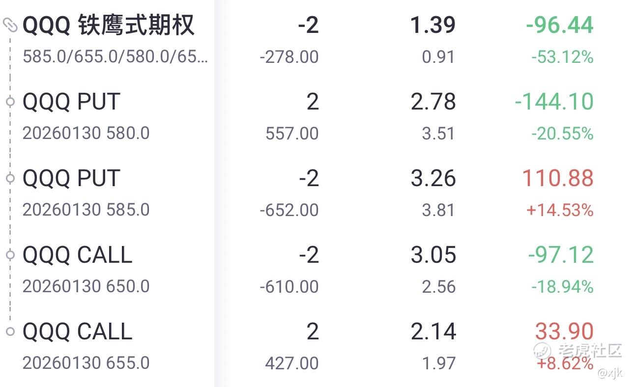 有没有朋友能帮我看看为什么我想买qqq的反向鹰氏期权,也就是预期qqq震荡,目前股价没什么变,但是老虎显示的亏这么多$QQQ 铁鹰式期权 260130 580.0P/585.0P/650.0C/655.0C -1/1/1/-1$