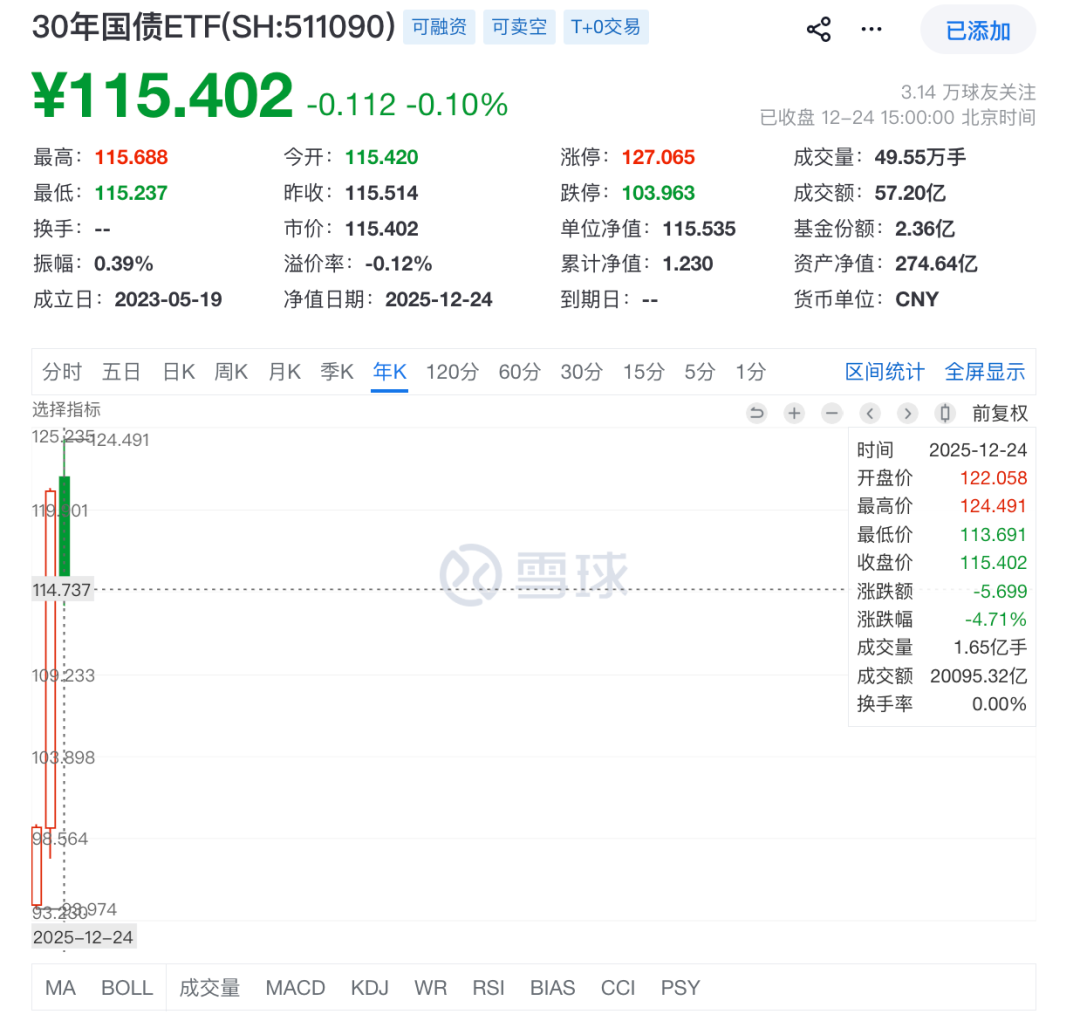 还有一个是今年人民币降息只有1次10基点,原本预期是有30基点的。但美元是正常降息的,人民币降息少了的,这么一对比,人民币不就是被动升值了。而且,因为人民币降息少,所以你看30年国债ETF今年跌的有点多: