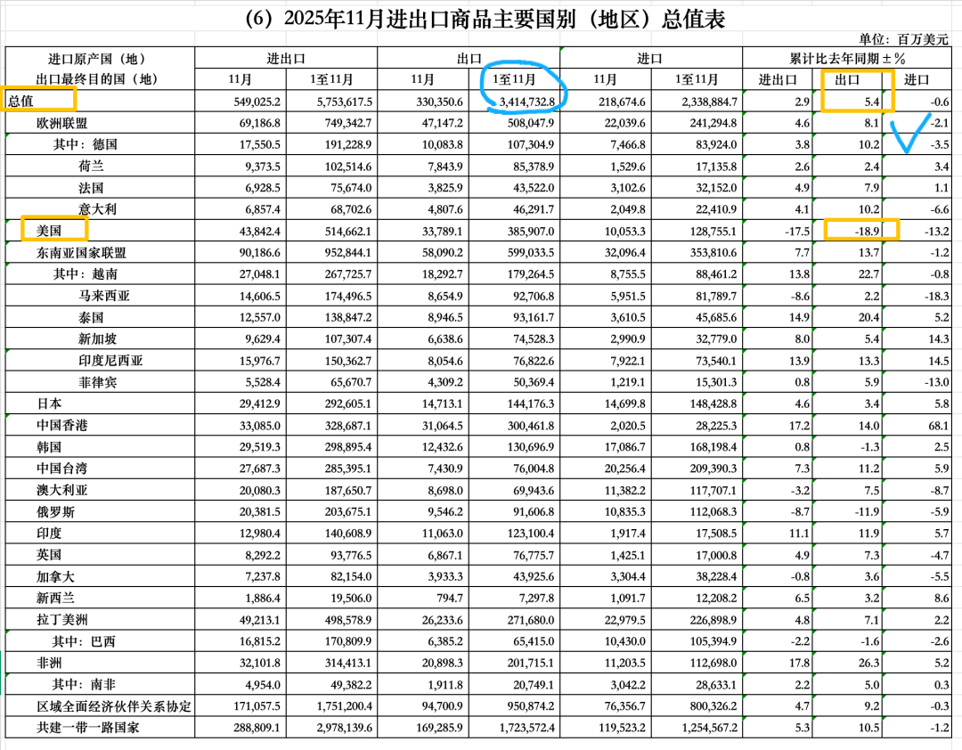 我只能说中国的出口太无敌了。在我们对美国1-11月累计出口下滑18.9%的情况下,我们1-11月累计出口按照美元计价还是增长了5.4%。我们的贸易顺差太高了。这也是我们最近人民币升值的一个底气。