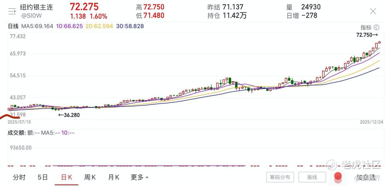 其中,贵金属延续牛市,12月24日,COMEX黄金期货站到4550美元/盎司上方,COMEX白银则飙升至72美元/盎司以上,二者均有望创下1979年以来的最强年度表现。同时,铜价刷新历史高位至11952美元/吨,铂金因连续三年供应短缺,价格同步走高。