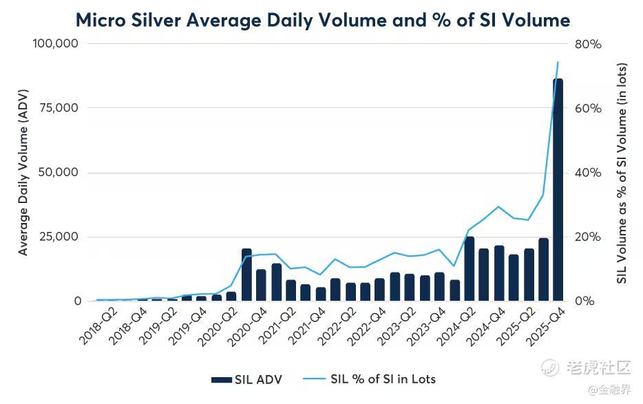 芝商所微型白银期货(SIL)的合约规模为基准白银期货的1/10,为微调市场风险敞口和提升交易策略提供一种高效、低成本的新方式。微型合约深厚的流动性使市场参与者在2025年能够进行有效的交易。数据显示,微型白银(SIL)期货日均成交量高达74,901手创新高。