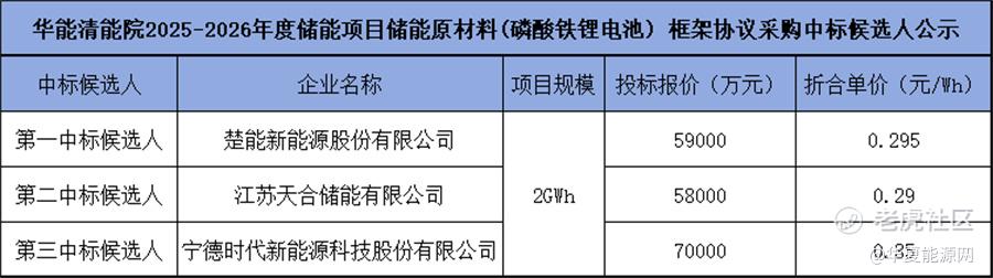 华夏能源网注意到,12月10日,中国华能公布了华能清能院2025-2026年度储能框采候选人结果。其中,1GW/2GWh储能电池框采,要求单体电池容量不低于314Ah。最终,楚能新能源、天合储能、宁德时代(SZ:300750)三家企业入围,报价分别为0.295元/Wh、0.29元/Wh、和0.35元/Wh,前两名的报价均处于电芯价格年内低点。