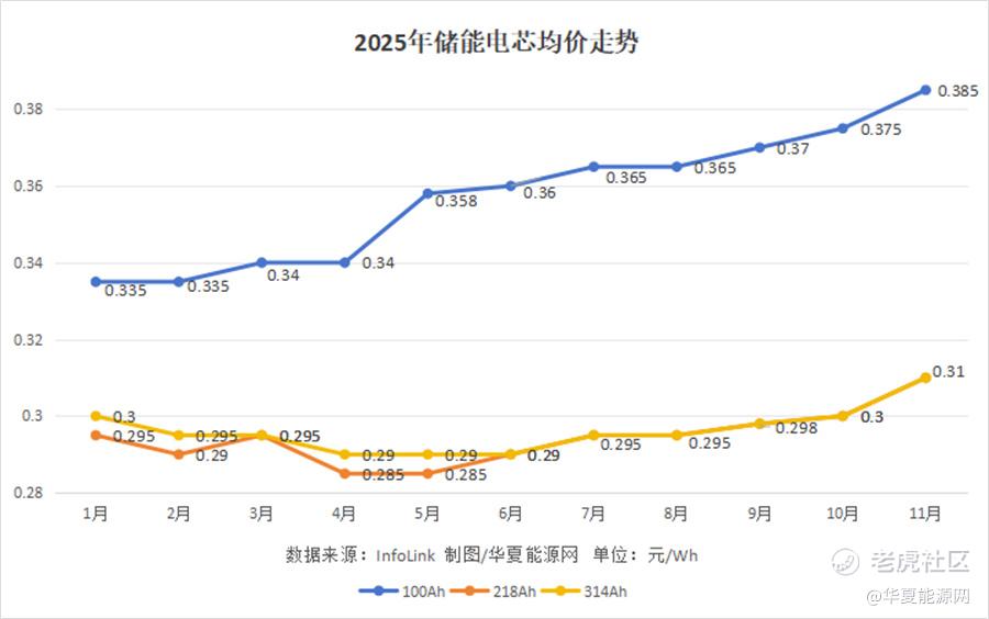 电芯环节处在材料环节的下游,也很早就开启了上涨行情。InfoLink数据显示,280Ah及314Ah储能电芯的均价,在5月触底后,6月小幅回升至0.29元/Wh,此后一路上行,10月站稳0.3元/Wh,截至11月20日,均价已升至0.31元/Wh。此外,100Ah储能电芯均价也出现了明显的上涨。