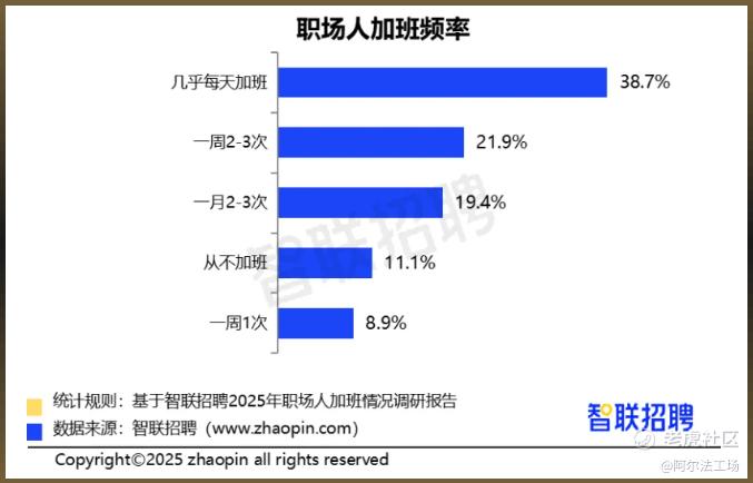 据《2025职场人加班情况调研报告》显示,38.7%的职场人几乎每天加班,43.9%的职场人兴趣与社交时间被加班挤压;年轻人为反抗过度工作支配,更易出现“报复性熬夜”。“白天拼命干,深夜报复玩”,早已成了日常。