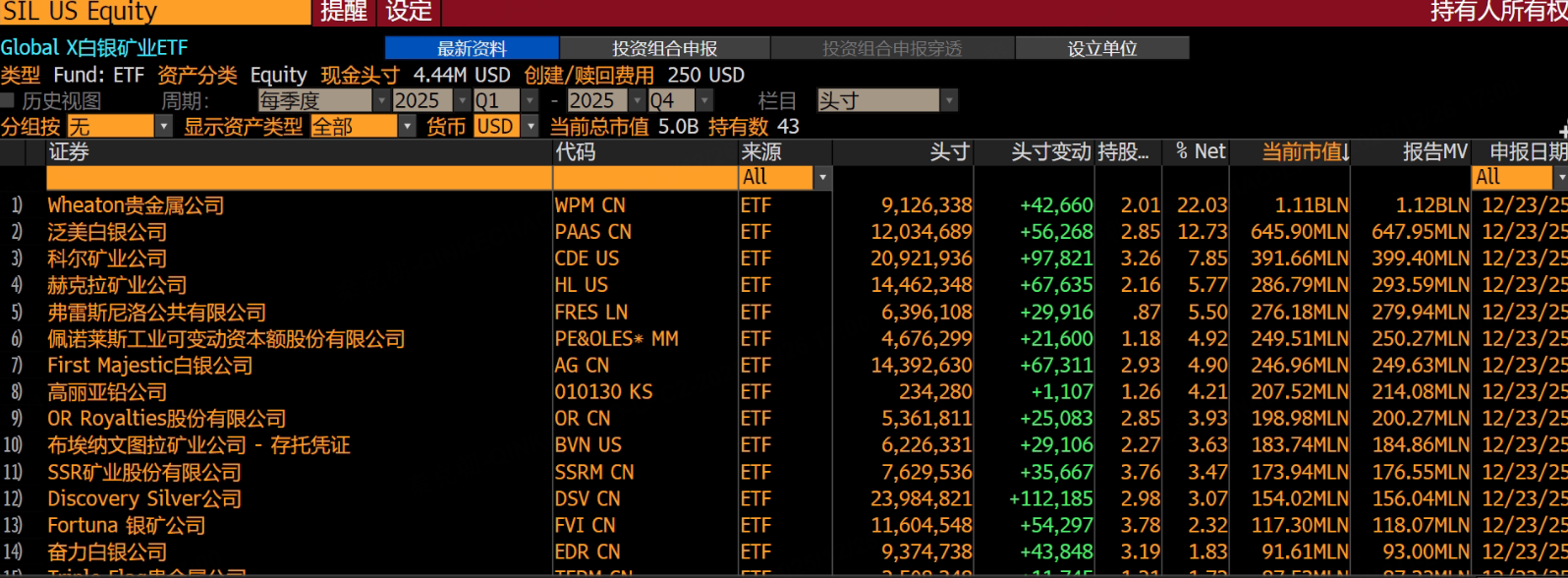 涨幅第五的是 $Silver Miners Etf(SIL)$ ,中文名:Global X白银矿业ETF,年回报超176%。相比其他白银ETF,SIL的规模更大、持仓数量更多、流动性更好,更能分散风险,但年费用率略高一些: