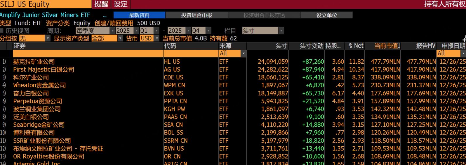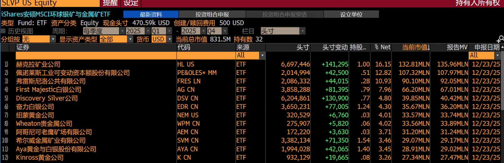 其中,今年涨幅最大的是 $iShares MSCI Global Silver and Metals Miners ETF(SLVP)$ ,中文名字是:iShares安硕MSCI环球银矿与金属矿ETF,年内总回报超211%。该ETF跟踪全球从事白银勘探或金属开采业务的公司,第一大持仓股是 $赫克拉矿业(HL)$ ,占净值比例16%:
