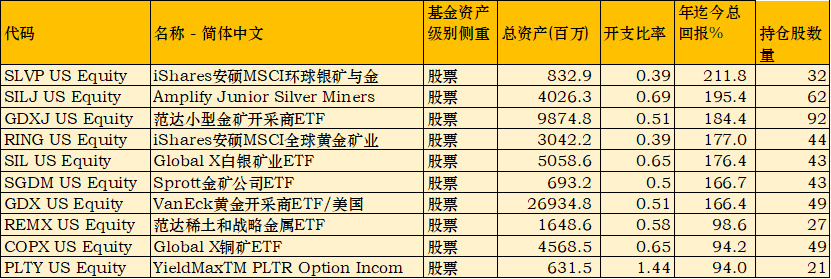 涨幅第六的是 $Sprott Gold Miners ETF(SGDM)$ ,中文名:Sprott金矿公司ETF,年回报超166%。相比其他金矿ETF,SGDM规模只有7亿美元,比较小。