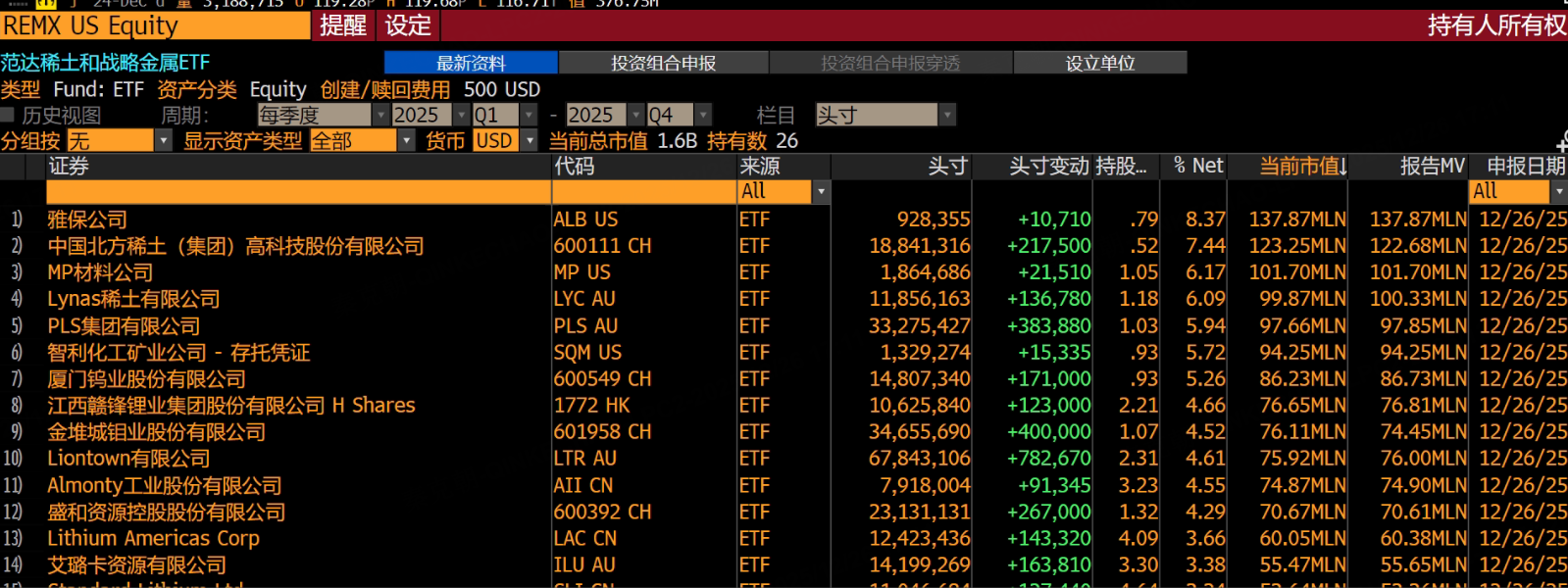 涨幅第八的是 $VanEck Rare Earth and Strategic Metals ETF(REMX)$ ,中文名:范达稀土和战略金属ETF,年回报99%,持仓股偏向稀土,第一大持仓股为 $美国雅保(ALB)$ ,第二大持仓股为 $北方稀土(600111)$ ,含中量比较高: