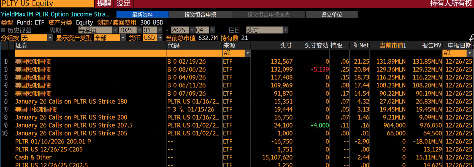 涨幅第十的是 $PLTR期权收益策略ETF-YieldMax(PLTY)$ ,是特殊的ETF,不直接持有股票,而是利用期权策略来模仿对 $Palantir Technologies Inc.(PLTR)$ 的敞口,并通过卖出看涨期权(call options)来赚取期权费收入。它会持有现金和美国国债作为抵押: